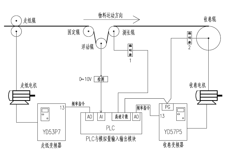 In the paper printing production, there are processes related to winding operations such as unwinding and rewinding, the paper tension changes dynamically. If the tension is too small, the paper will become loose and wrinkled, and it will also deviate horizontally, resulting in uneven edges of the paper roll. If the tension is too large, it will cause the paper to be over-stretched, and raised ribs will appear on the surface of the paper. In severe cases, the paper may even be deformed and broken. In order to ensure the production efficiency, the surface quality of the paper and the neatness of the edges of the paper roll, it is very necessary to maintain a constant tension. This system ensures a constant tension on the paper by controlling the speeds of the paper feeding roller and the rewinding roller, which belongs to the synchronous control of speeds.