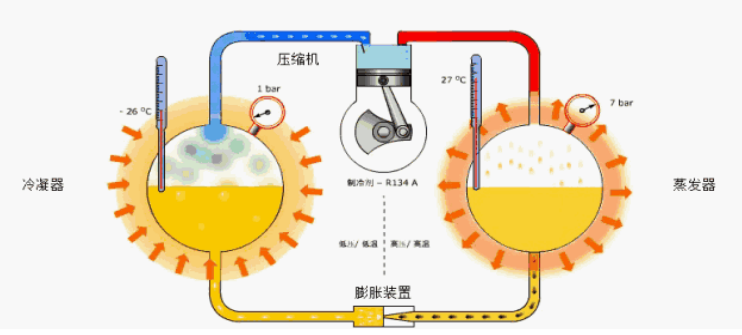 蒸發冷一體機的壓縮機將蒸發器的低溫低壓制冷劑氣體吸入,壓縮成高溫高壓氣體,再排入冷凝器,與冷媒水進行熱交換而成為低溫高壓的制冷劑液體。
